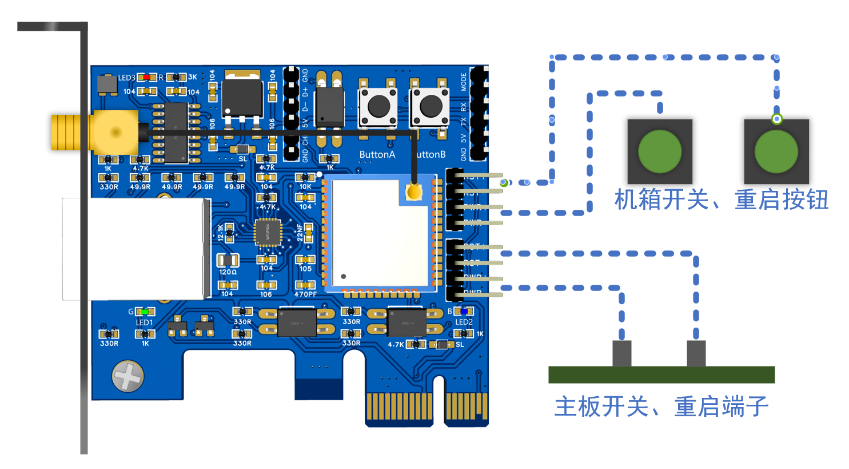 本设备可以通过USB数据通道确认信号、PCIE开机供电信号、5V电压检测引脚来检测被控主机是否开机
